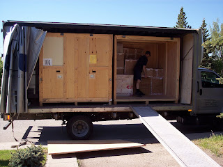 Woensdag 30 en donderdag 31 mei kwamen de verhuizers ons huis weer inrichten. Onze spullen bleken ook na aankomst in Calgary weer overgeladen te zijn in grote houten kisten. De zeecontainer wordt namelijk zo snel mogelijk leeg gemaakt om de kosten van het transport te drukken. Er konden 2 van die kisten in 1 vrachtwagen, er bleek 2 keer gereden te moeten worden voor in totaal 4 kisten. We moesten zelf iedere genummerde doos aftekenen op een paklijst, zodat je daarna kan tekenen dat al je spullen ook daadwerkelijk aangekomen zijn.