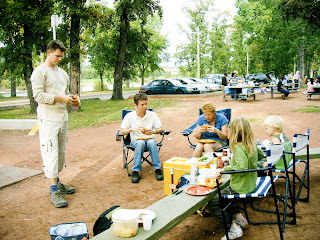 Liesbeth. My first long weekend during my 'working life'. We spend labour day BBQ-ing with fellow dutchmen Rob, Anette and their children Eline and Peter. Rob is working on the same project as Sander is. They just arrived from the Netherlands a week ago. Labour day was a perfect opportunity to introduce them to canadian park bbq-ing and marshmallows. The weather was beautiful and the park was full of families. A bit like in Rotterdam in our park (Kralingse Bos). We did it the canadian way and also took chairs, bbq, enormous cooler and huge bags and tried to park as close as possible! In the Netherlands you can never enter a park by car, that's why I joke a little and call it 'the canadian way'. We BBQ-ed 'kids food' but the grown ups liked it even better than the kids.