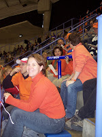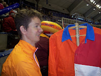 Heb je ons zien zitten in de bocht na de finish afgelopen zaterdag? Ik was die idioot die zo'n oranje bouse op een stok rondzwaaide (sommigen van jullie herkennen 'de blouse' natuurlijk gelijk, vandaar dat ik die ook had meegenomen. En net als toen heb ik 'm natuurlijk NIET AAN gedaan!). We moeten toch breeduit op TV gekomen zijn zo op de eerste rij. Het was erg leuk op die tribune, gezellig, we zage dat er dropjes werden uitgedeeld (toch met een canadees accent want ze ztaen in een ziploc bag) en de voertaal was natuurlijk Nederlands. We hebben er mensen gezien die we 'kenden'via wederzijdse weblogs. En natuurlijk enorm gejuicht, Sven Kramer reed heel hard in onze bocht omdat het hem er teveel herrie was (denken wij). Hartstikke leuk om getuige van een wereldrecord te zijn. Ik denk dat we morgen weer gaan, we hebben de smaak te pakken. De tijd voor de echte wedstrijden is ook erg leuk, dan staan al die bekende schaatsers en coaches gewoon pal voor je neus. En dan maar kijken of je iedereen herkent, soms best lastig!