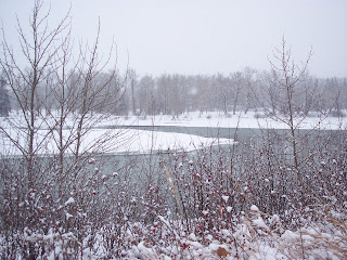 For dutch standards there we got a lot of snow in Calgary this thursday and saturday (somewhere between 10 and 20 cm, I guess). We had a beautiful walk along the river in the snow saturday while it was snowing. When we headed out we met 2 cross country skiiers on the path just across the corner of our house. No tracks were set of course, but they were doing very well. The ice in the Bow river is growing steadily, the river is getting smaller each week.