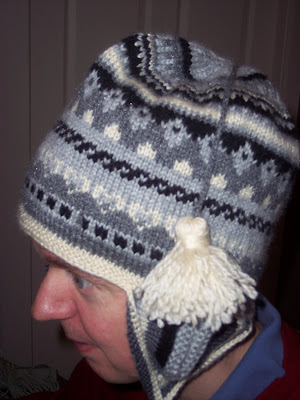 Ik ben vorige winter voor mezelf gestart met een nieuwe warme muts, die heb ik afgelopen november eindelijk afgebreid. Rondbreien, 3 kleuren wol die harstikke door elkaar gingen in dat rondbrei-werkje, verschrikkelijk! Maar nu zag ik een gewoon gebreid patroon van zo'n grappige noorse muts met oorflappen en kwast, vast leuk voor Sander, bedacht ik. De muts was zo klaar omdat het geen rondbrei-patroon was. Een dotje, niet waar (Sander en de muts natuurlijk!)?