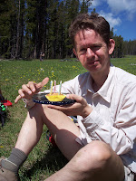 Gisteren hebben we Sanders verjaardag gevierd. We zijn met twee van onze running club vrienden, Carla en Dave, Sulphur Springs loop gaan wandelen (weer in Bragg Creek). Ik wandelde rond met cupcakes en kaarsjes in m'n rugzak ter ere van Sanders verjaardag. Na een uurtje of zo begonnen die cupcakes ons te roepen dus rusten we met lunch en cake in een mooie meadow, een stuk gras tussen de bossen. Dave wilde voor Sander een stuk muziek spelen en miste zijn bril. Die moest op die boomstronk zijn blijven liggen langs het wandelpad toen hij zijn shirt uit had gedaan. Sander en Dave hebben daarom het meest steile stuk van de wandeling twee keer gedaan om die bril terug te halen. Hij lag er inderdaad nog. Ondertussen hebben Carla en ik heerlijk in de zon gelegen (circa 25 graden), al hoewel er wel heel wat mieren ons belaagden. Dave heeft nog fluit gespeeld en gezongen voor ons, hij heeft echt een goede stem. We hebben het hele schotse volkslied gehoord, hartstikke leuk.